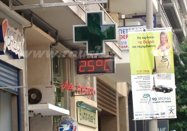 LED temperature time sign on a pillar in a shopping mall in Petrich, Bulgaria.