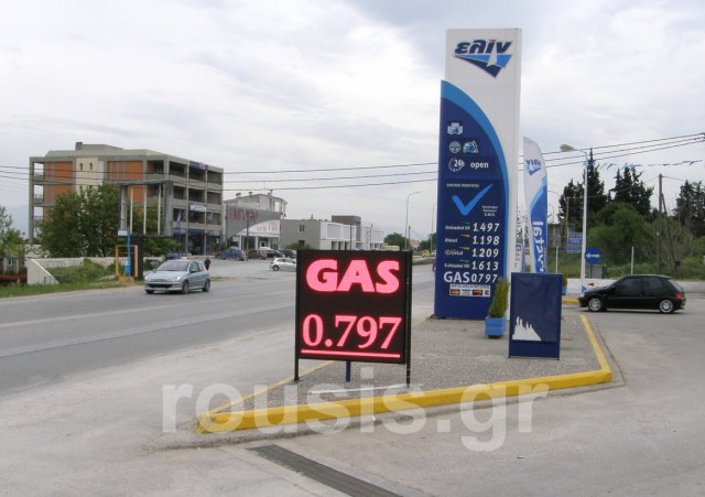 Πρατήριο με πινακίδες τιμών καυσίμων LED στις Σέρρες.