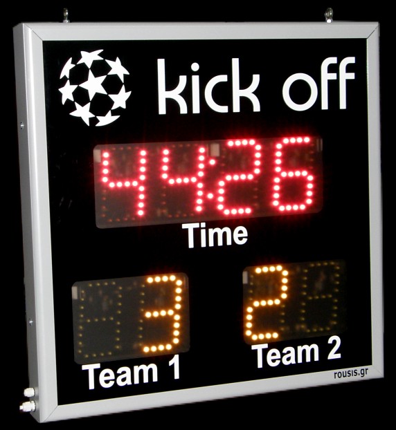 High quality scoreboard, displays match's time and score. With onboard horn for sound signal, appropriate for various types of stadiums and sports like football, basketball, volleyball, water polo and more. With high quality LEDs and automatic brightness control, displaying time and temperature before and after the game. Easy operation with wireless keyboard or PC or tablet by wireless connection.With lighting area on the top for your logo or any sponsor advertising!