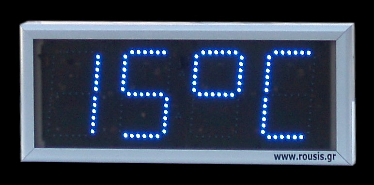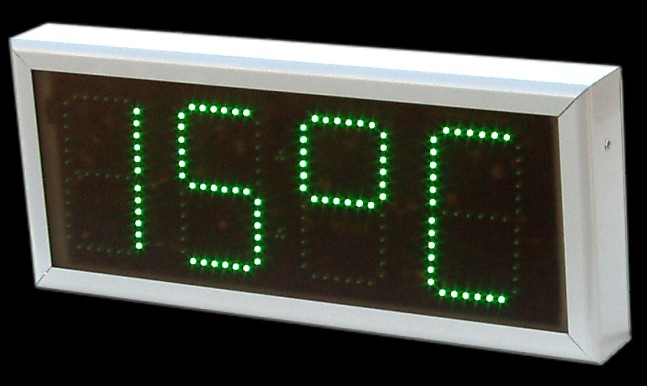Outdoor Time Temperature LED sign of 21 cm digit height. Designed and manufactured by our company with materials of excellent quality that ensure accuracy and lifetime for more than 16 years (if 24/7). It combines high performance with low power consumption thanks to an automatic photo sensor system which adjusts the LED brightness according to the external weather conditions. It is easy to operate with a wireless infrared remote control.
