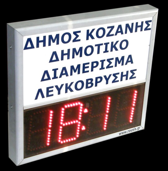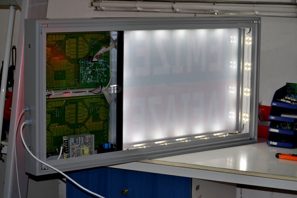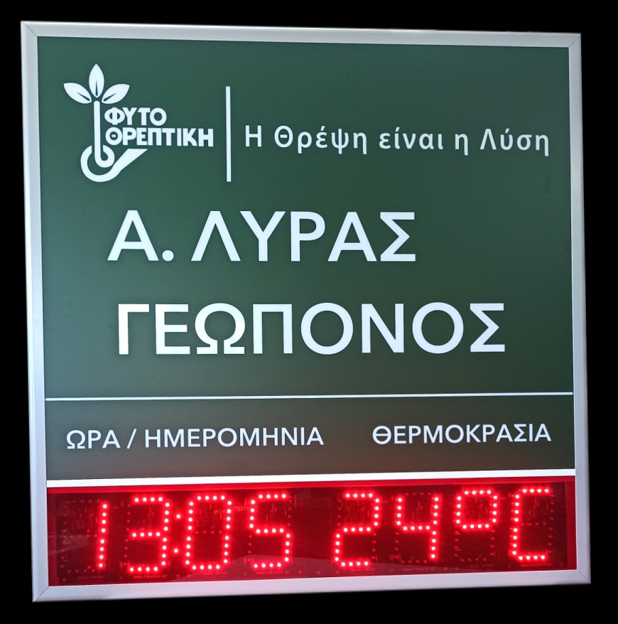 High quality mixed electronic and bright signs designed by our company! They consist of two parts: a back-lighting part and an electronic part with a clock-temperature. In the bright part you can chose to place a digital print on vinyl: image, logo, etc. In the electronic part, the display shows time, date, ambient temperature and option to display humidity %.