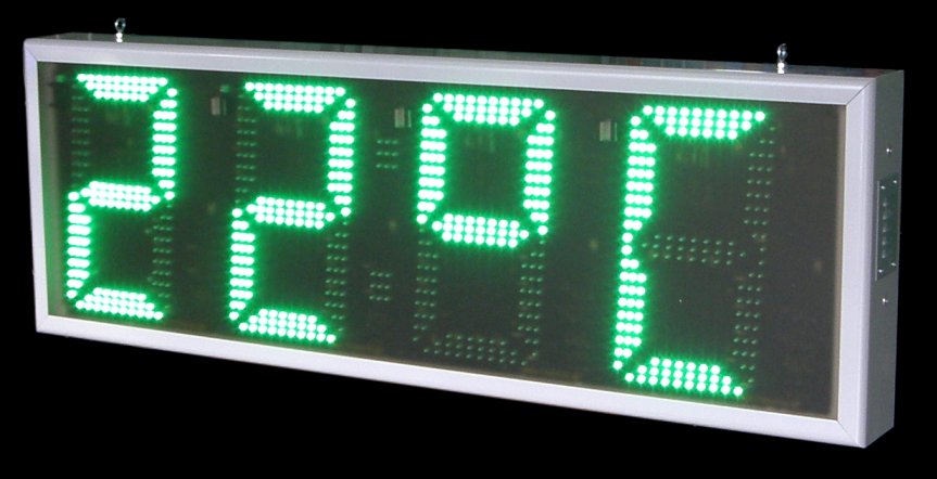 Πινακίδα: Ψηφιακό Ρολόι - Θερμόμετρο LED εξωτερικού χώρου 38 cm εξ ολοκλήρου δικής μας σχεδίασης - όχι εισαγωγής! Κατασκευάζεται από την εταιρεία μας με επιλεγμένα υλικά εξαιρετικής ποιότητας που εξασφαλίζουν ακρίβεια αλλά και διάρκεια ζωής για περισσότερα από 16 χρόνια (αν 24/7). Συνδυάζει υψηλή απόδοση με χαμηλή κατανάλωση ισχύος, καθώς διαθέτει αισθητήρα αυτόματης ρύθμισης φωτεινότητας με βάση τις εξωτερικές συνθήκες. Η σχεδίασή του είναι καλαίσθητη με ελαφρύ σκελετό αλουμινίου και ανθεκτικό ακρυλικό (plexi-glass) οπτικό κάλυμα. Ο χειρισμός του γίνεται εύκολα με ασύρματο τηλεχειριστήριο υπερύθρων.